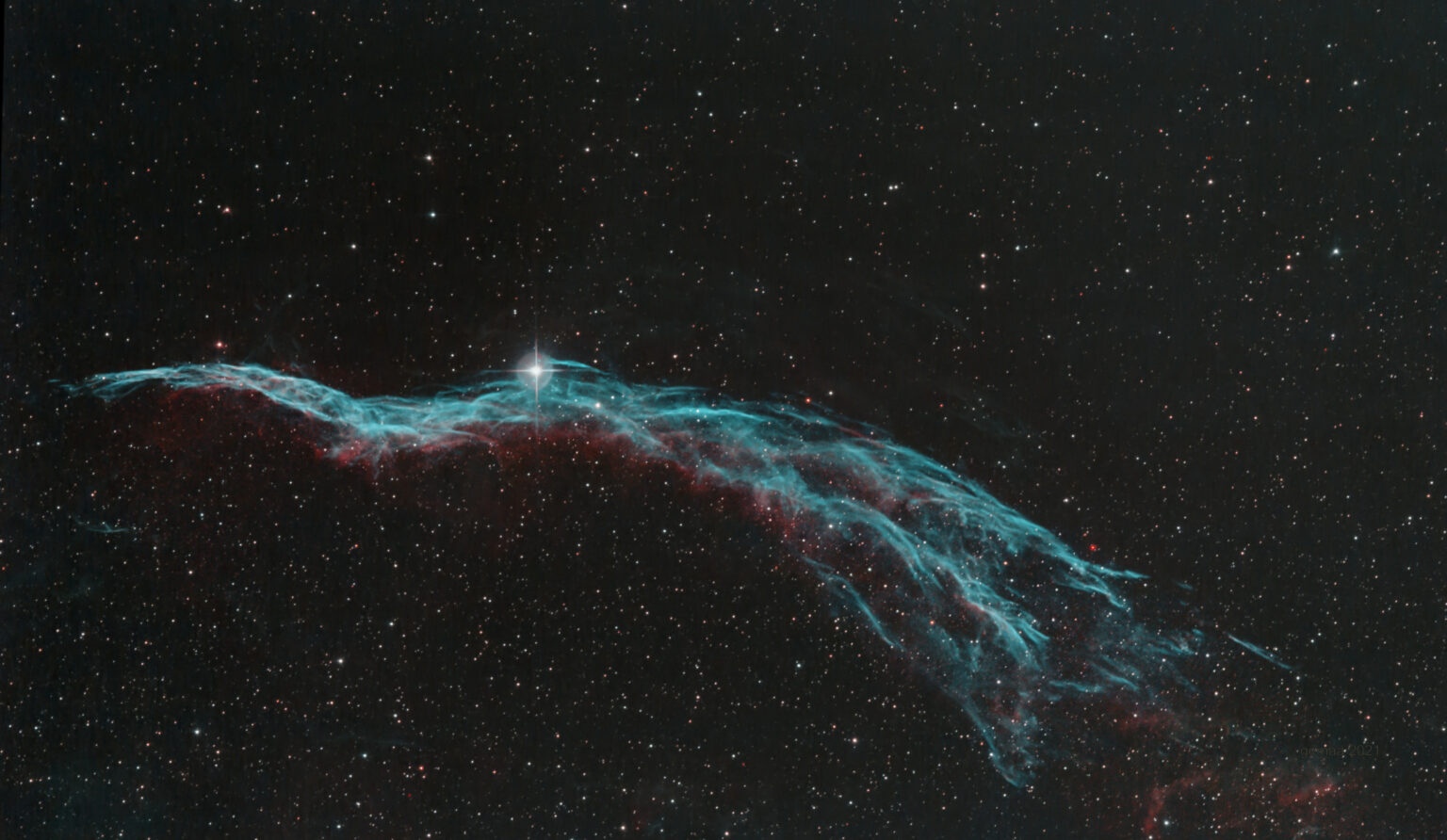 Hier zeige ich ein Motiv aus dem Cirruskomplex. Den NGC6960 auch Filamentnebel genannt, habe ich mit Dual-Schmalbandfilter und ohne Filter aufgenommen. Der Filter läßt größtenteils Ha- und OIII-Farben (rot-türkis) passieren und verstärkt sie, da ein heller Hintergrund (Mond, Lichtverschutzung) zum Teil ausgesperrt wird. Die Dual- und RGB-Daten habe ich dann später zusammengemischt, um auch die Sternfarben realistisch darzustellen zu können.