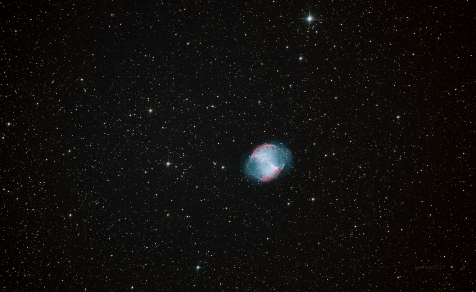 Der Hantelnebel ist sehr klein, besitzt aber sehr viele Wasserstoff- und Sauerstoffelemente. Deshalb kam auch wieder mein Dualband-Filter L-Extreme zum Einsatz. Damit konnte ich die Rot- (Ha) und Türkisfarben (OIII) im Bild verstärken.