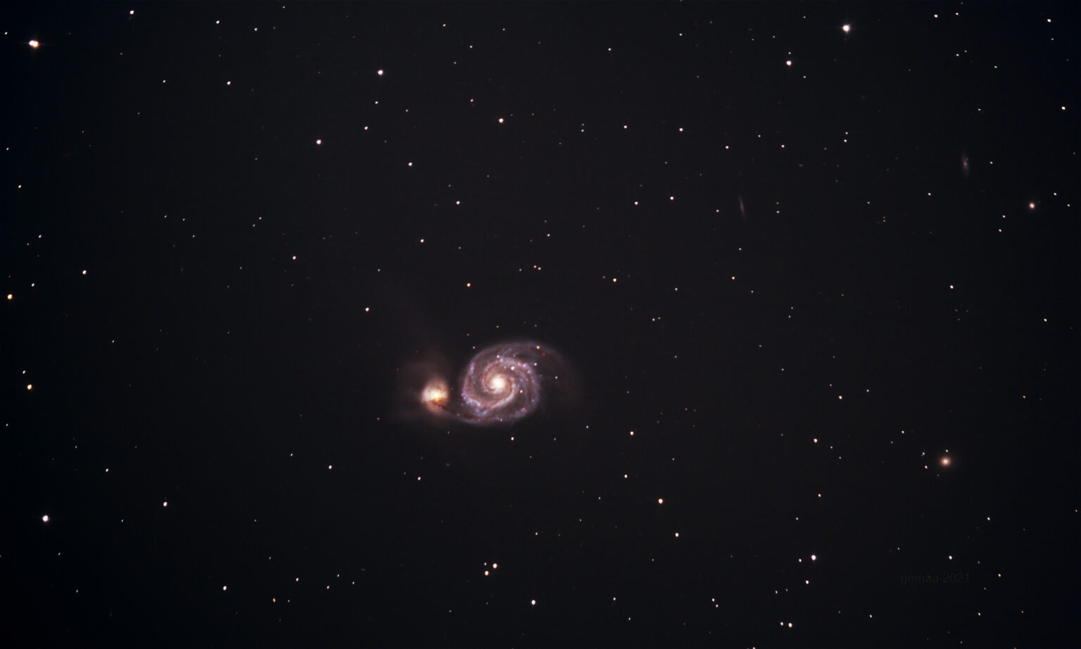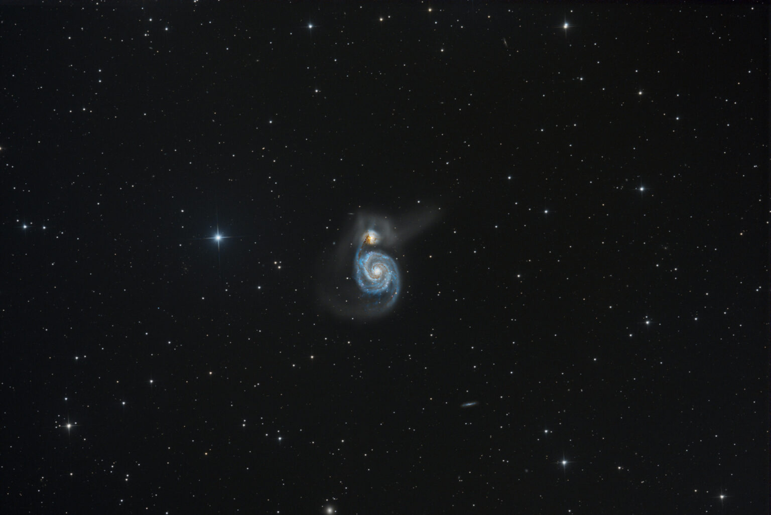 Die Whirlpool-Galaxie ist meine Lieblings-Galaxie. Sie ist zwar sehr klein, zeichnet sich aber bereits in den Einzelaufnahmen sehr lichtstark ab. Die fotografische Leistung im ersten Foto läßt zwar noch etwas zu wünschen übrig, aber es gehört zu den ersten Aufnahmen mit meinem 800mm-Teleskop auf 3-Bein-Stativ. Ich möchte noch auf die 2 weiteren winzig kleinen Galaxien auf dem Bild hinweisen. Die Entfernung zu denen dürfte im wahrsten Sinne des Wortes astronomisch sein.